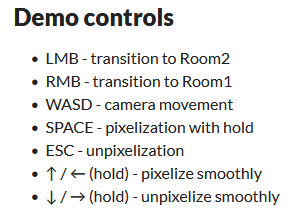 - Pixelization → room change → unpixelization - smooth transition with frozen image
