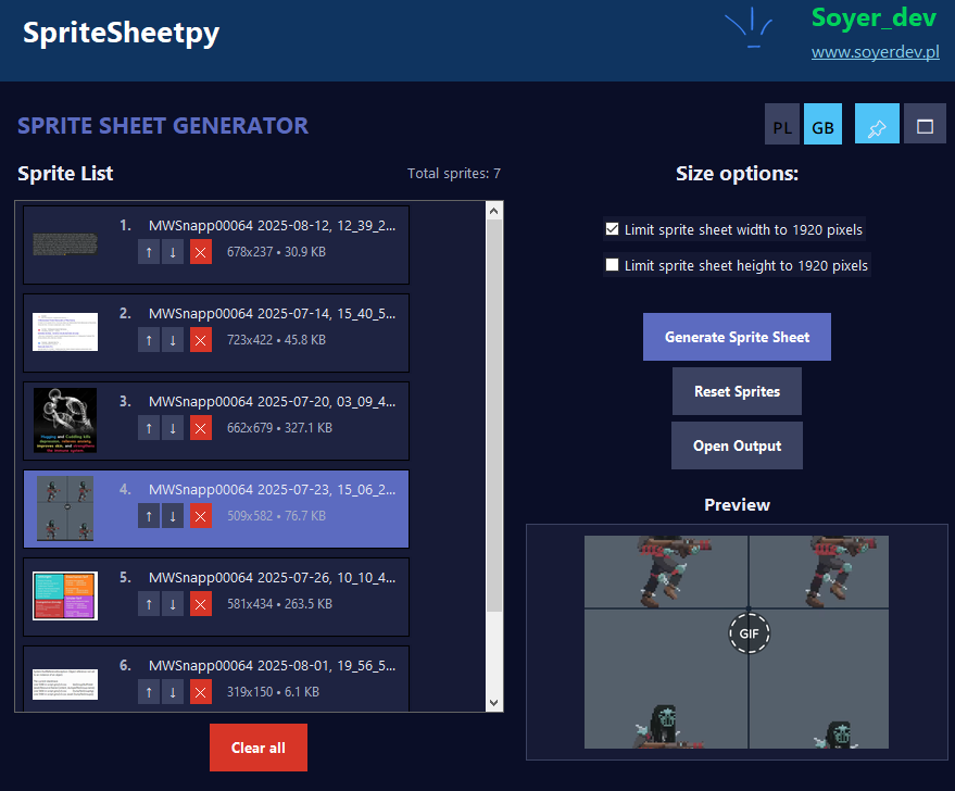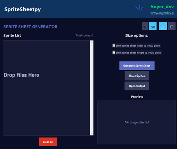sprite sheet generator. drag and drop images/sprites and click Generate Sprite Sheet. The sprite will be created in the folder where the program is located. Created in python.